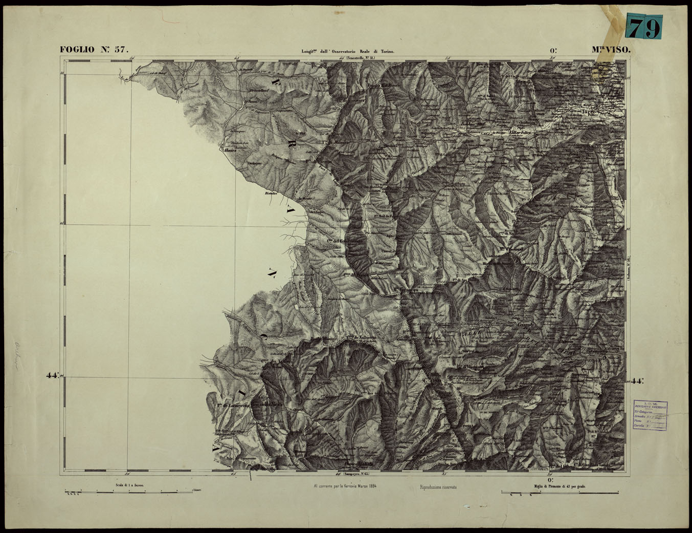 CARTA TOPOGRAFICA DEGLI STATI IN TERRAFERMA DI S.M. IL RE DI SARDEGNA ALLA SCALA DI 1.A 50.000. OPERA DEL CORPO REALE DELLO STATO MAGGIORE - FOGLIO N.°57. MONTE VISO