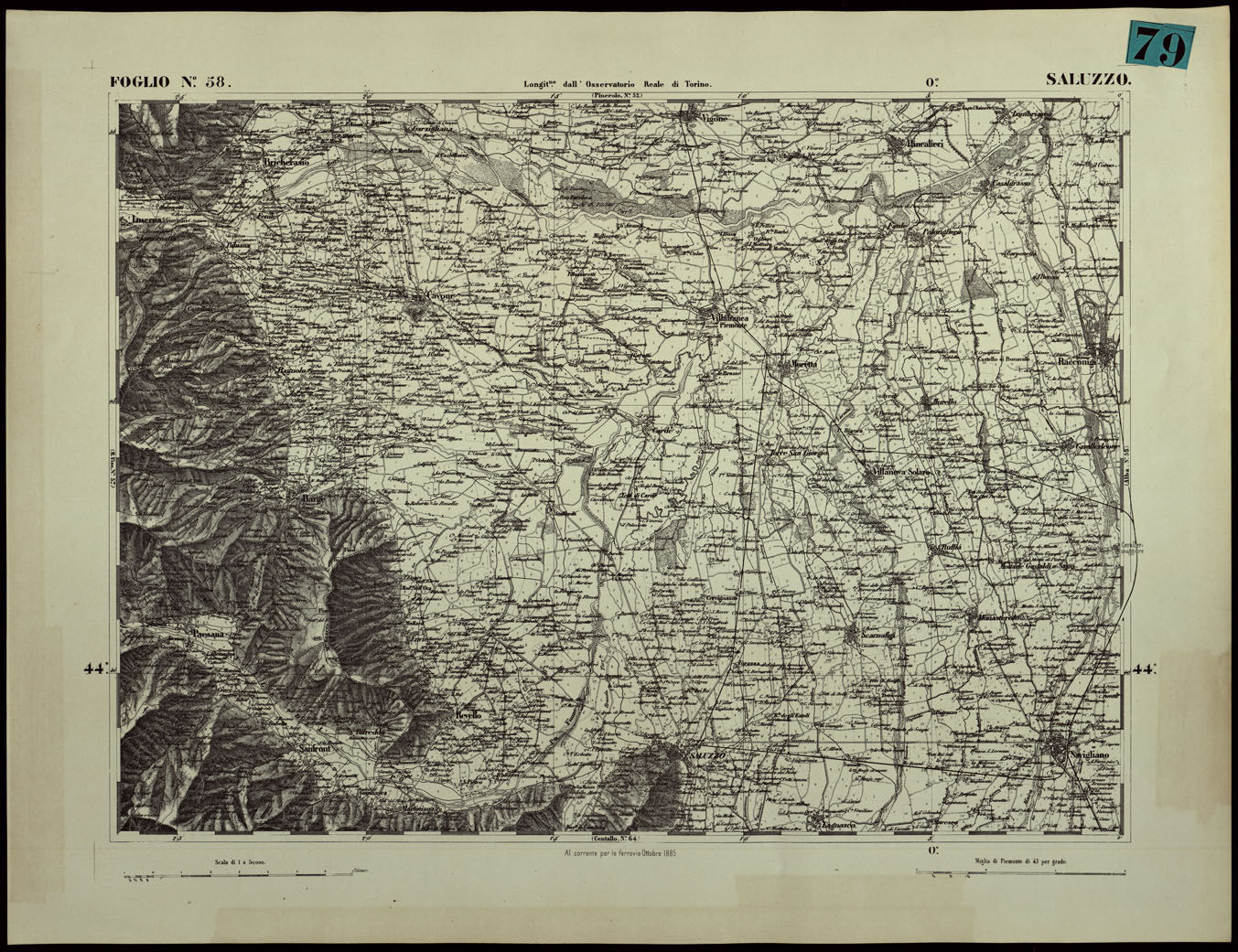 CARTA TOPOGRAFICA DEGLI STATI IN TERRAFERMA DI S.M. IL RE DI SARDEGNA ALLA SCALA DI 1.A 50.000. OPERA DEL CORPO REALE DELLO STATO MAGGIORE - FOGLIO N.°58. SALUZZO