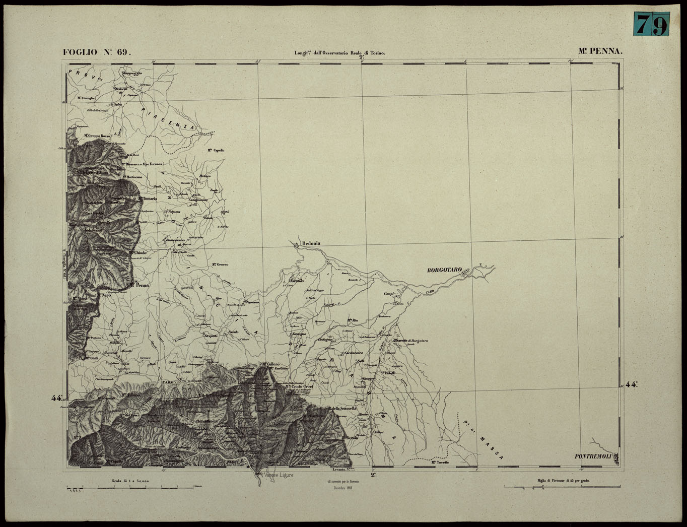 CARTA TOPOGRAFICA DEGLI STATI IN TERRAFERMA DI S.M. IL RE DI SARDEGNA ALLA SCALA DI 1.A 50.000. OPERA DEL CORPO REALE DELLO STATO MAGGIORE - FOGLIO N.°69. MONTE PENNA