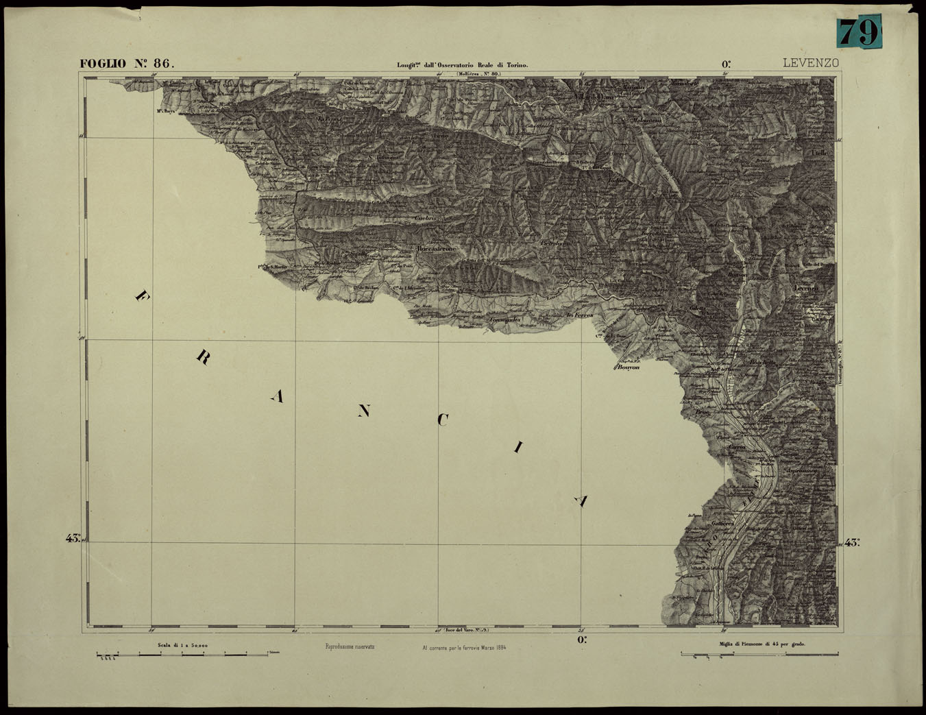 CARTA TOPOGRAFICA DEGLI STATI IN TERRAFERMA DI S.M. IL RE DI SARDEGNA ALLA SCALA DI 1.A 50.000. OPERA DEL CORPO REALE DELLO STATO MAGGIORE - FOGLIO N.°86. LEVENZO
