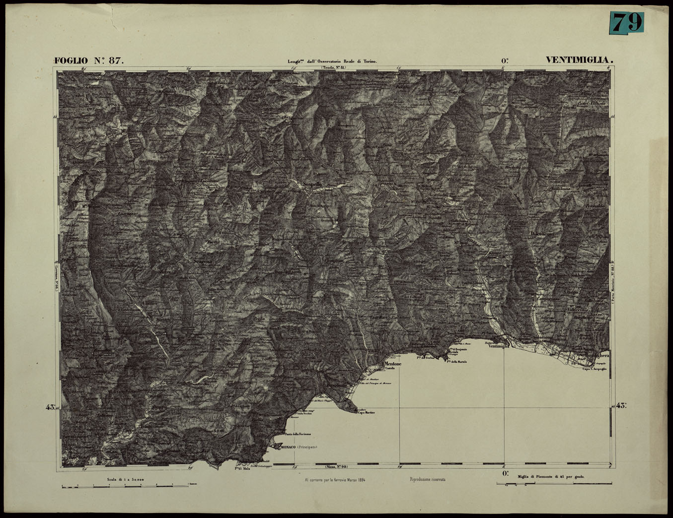 CARTA TOPOGRAFICA DEGLI STATI IN TERRAFERMA DI S.M. IL RE DI SARDEGNA ALLA SCALA DI 1.A 50.000. OPERA DEL CORPO REALE DELLO STATO MAGGIORE - FOGLIO N.°87. VENTIMIGLIA