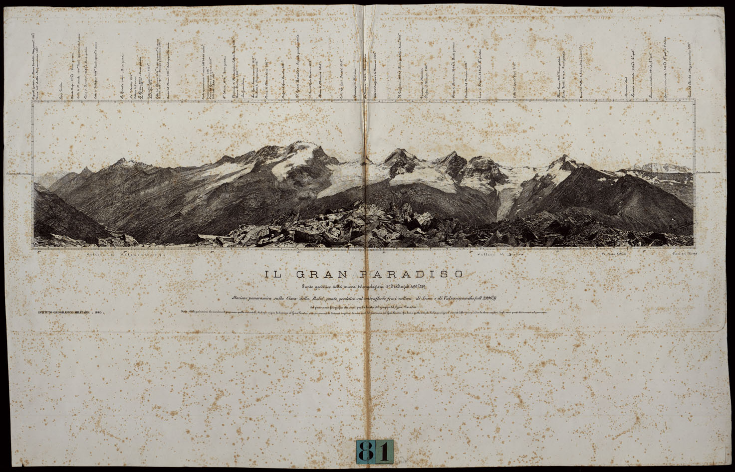 "Veduta fotografica del panorama che servì per la levata del Gruppo del Gran Paradiso. Stazione panoramica sulla Cima della Rolei, punto geodetico sul contrafforte fra i valloni di Seiva e di Valsavaranche (alt.2996,5). Delle graduazioni che circondano il panorama, quella orizzontale che ha per origine la direzione al Gran Paradiso, serve per conoscere le distanze angolari dei vari punti del panorama, del Gran Paradiso e fra loro, quella verticale che ha per origine l'orizzonte della stazione, indica le altezze angolari dagli stessi punti che trovansi nel panorama."
