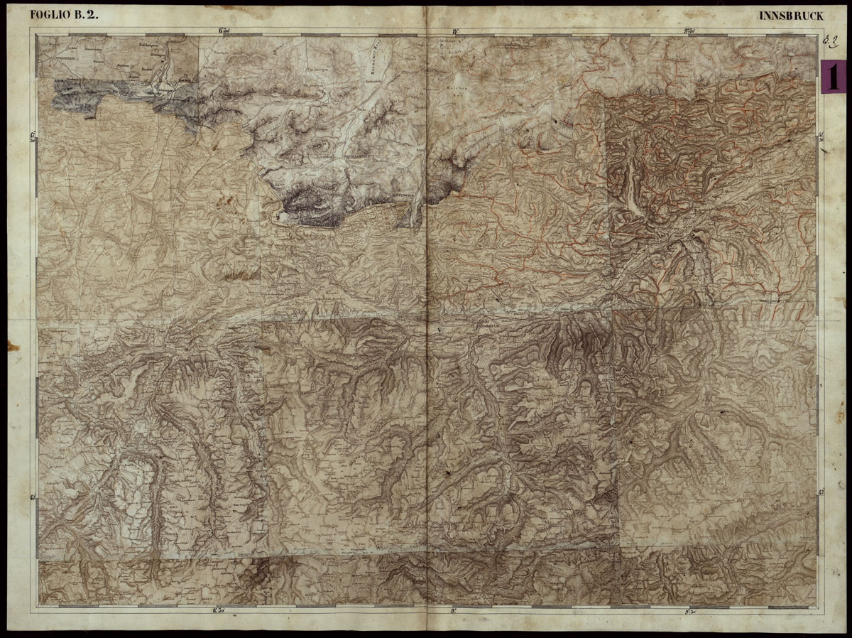 CARTA COROGRAFICA DEI VERSANTI SETTENTRIONALI E MERIDIONALI DELLE ALPI RETICHE CARNICHE E GIULIE IN 25 FOGLI - FOGLIO B.2 INNSBRUCK