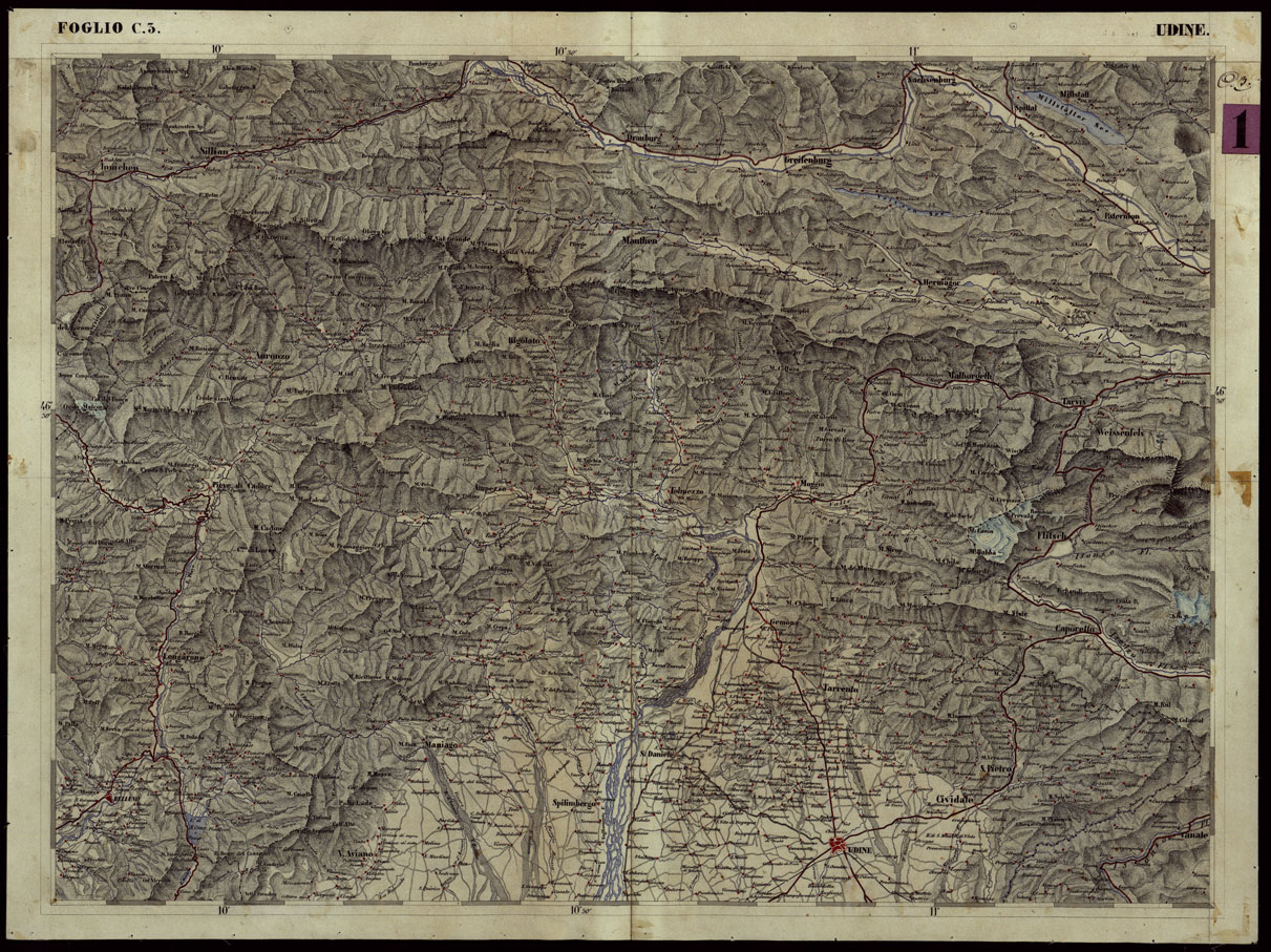 CARTA COROGRAFICA DEI VERSANTI SETTENTRIONALI E MERIDIONALI DELLE ALPI RETICHE CARNICHE E GIULIE IN 25 FOGLI - FOGLIO C.3 UDINE