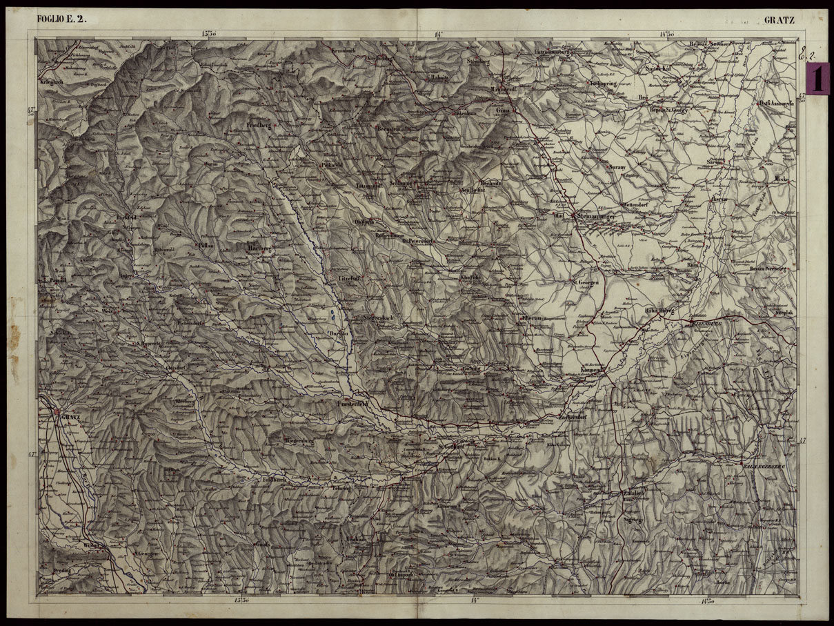 CARTA COROGRAFICA DEI VERSANTI SETTENTRIONALI E MERIDIONALI DELLE ALPI RETICHE CARNICHE E GIULIE IN 25 FOGLI - FOGLIO E.2 GRATZ