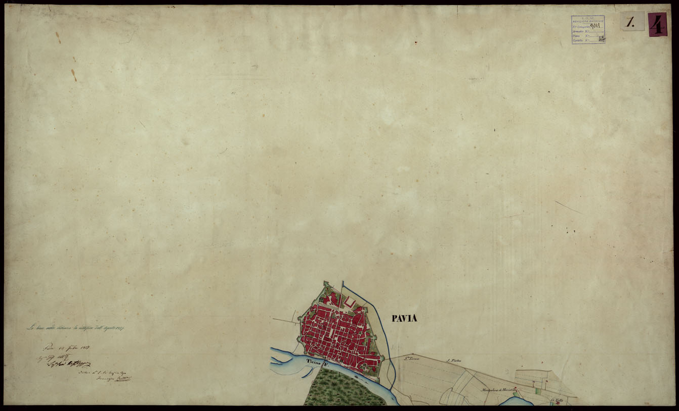 "Quarantasette fogli ad acquarello montati su tela. Alcuni sono firmati Ing. Tosi col visto dell'Ing. Capo Francesco Ratti e datati Pavia 1857. Altri sono datati da Cremona 1852 con altre firme. Vari mancano di firma e di data. V'è annesso un quadro di unione alla scala 1:330.000 firmato Carenzi Capitano. "