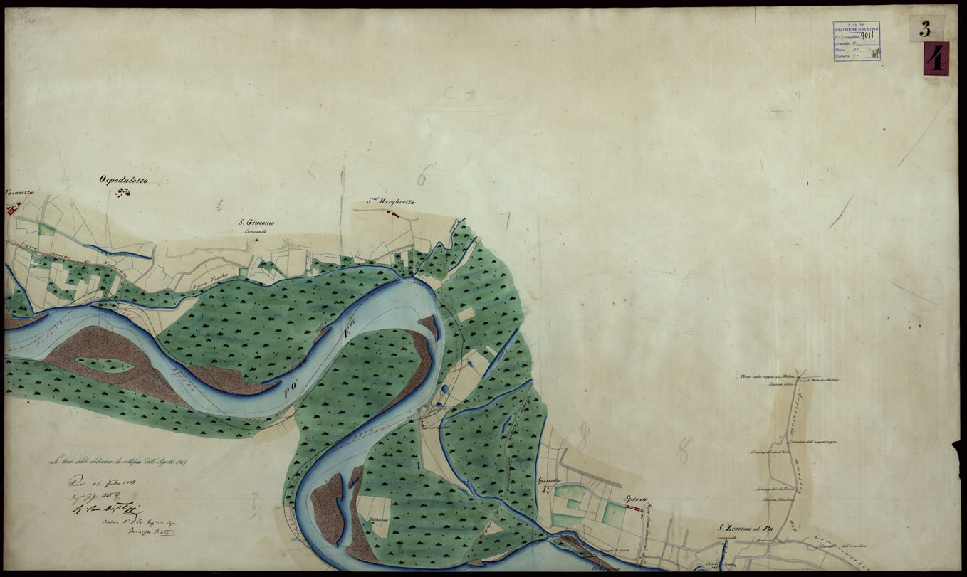 "Quarantasette fogli ad acquerello montati su tela. Alcuni sono firmati Ing. Tosi col visto dell'Ing. Capo Francesco Ratti e datati Pavia 1857. Altri sono datati da Cremona 1852 con altre firme. Vari mancano di firma e di data. V'è annesso un quadro di unione alla scala 1:330.000 firmato Carenzi Capitano. "