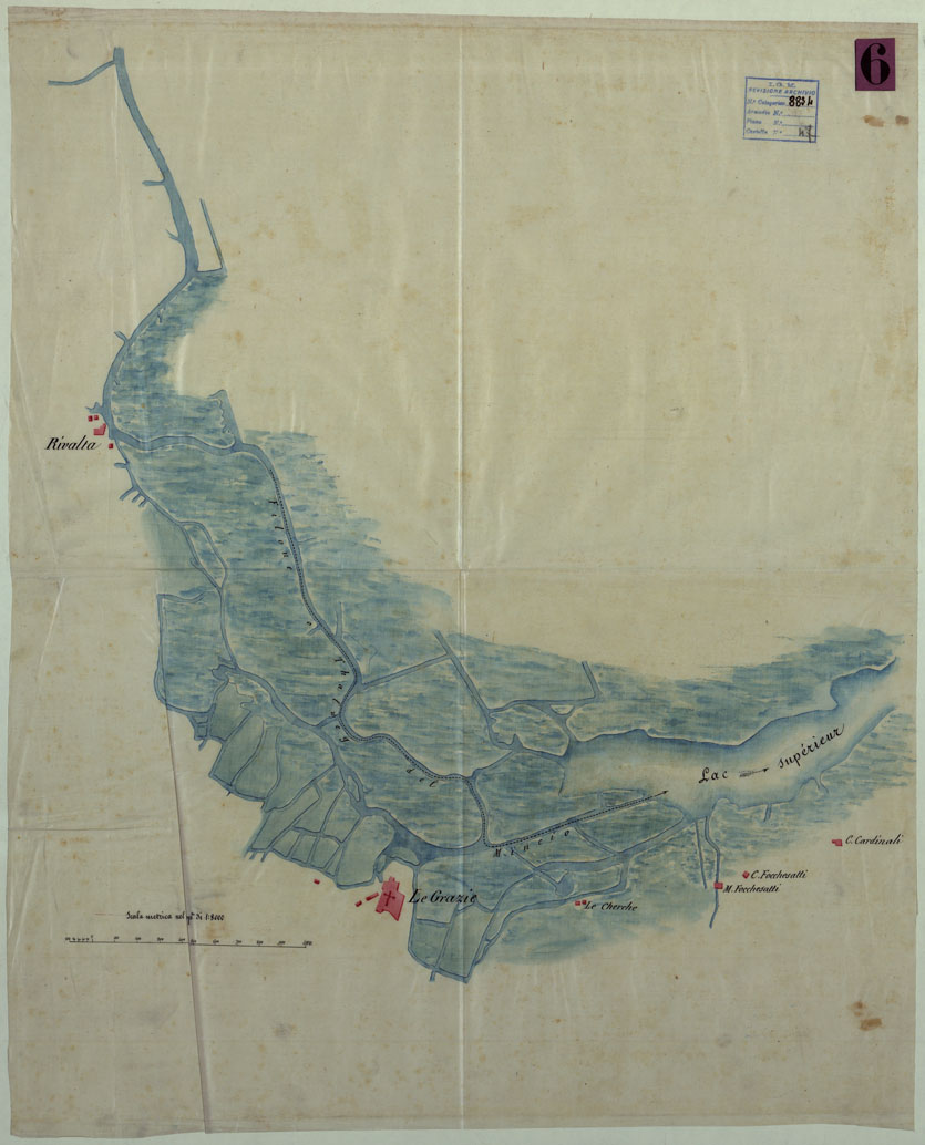 "Disegno su tela lucida. Due copie a colori e una terza in nero in sei piccoli fogli. Un secondo lucido su tela,pure a colori, si riferisce al tratto del Mincio tra Rivalta e C. Pardinali (Mantova). E' alla stessa scala e misura cm. 62x63."