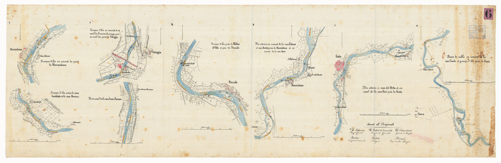 "Disegno su tela lucida. Due copie a colori e una terza in nero in sei piccoli fogli. Un secondo lucido su tela, pure a colori, si riferisce al tratto del Mincio tra Rivalta e C. Pardinali (Mantova). E' alla stessa scala e misura cm. 62x63."