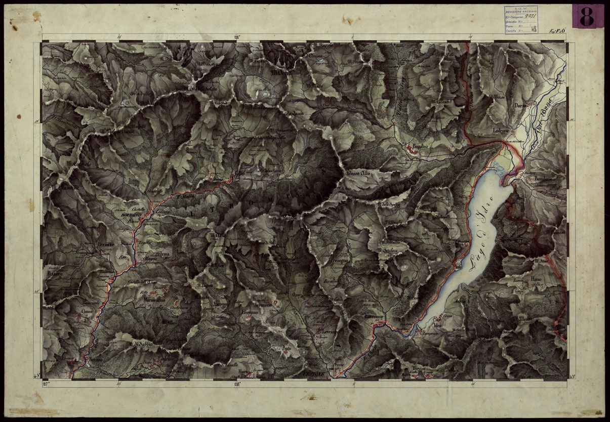 "Carta disegnata in 24 fogli montati su tela, senza titolo e senza data. L'annesso quadro d'unione reca il titolo "Prospetto dei fogli della carta topografica del Regno Lombardo Veneto disegno alla scala 1:43.200 dal vero". Sembra un lavoro fatto dall'Istituto Geografico Austriaco in Milano prima del 1848. La carta si estende da Brescia a Vicenza e da Asiago a Mirandola. L'orografia è rappresentata con acquerello a luce obliqua, l'idrografia è in azzurro le strade sono distinte in sei classi a mezzo di colori. Abitati in rosso. Sono pure distinti a colori boschi, paludi, prati, pascoli: sono indicati i passaggi sui fiumi, gli abitati isolati, ecc. Per la stampa della carta eseguita nel 1859 v. il N°115 d'ordine, Doc. 22 Cartella N°58."