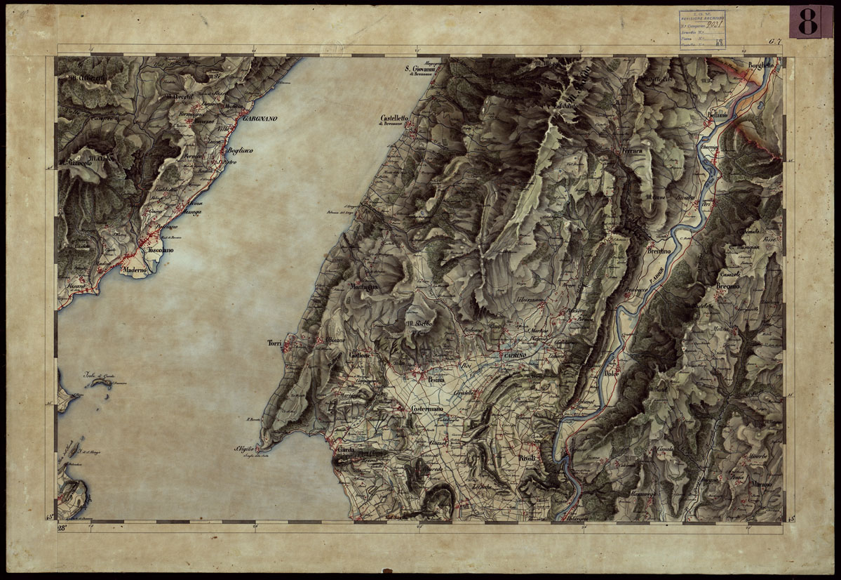 "Carta disegnata in 24 fogli montati su tela, senza titolo e senza data. L'annesso quadro d'unione reca il titolo "Prospetto dei fogli della carta topografica del Regno Lombardo Veneto disegno alla scala 1:43.200 dal vero". Sembra un lavoro fatto dall'Istituto Geografico Austriaco in Milano prima del 1848. La carta si estende da Brescia a Vicenza e da Asiago a Mirandola. L'orografia è rappresentata con acquerello a luce obliqua, l'idrografia è in azzurro le strade sono distinte in sei classi a mezzo di colori. Abitati in rosso. Sono pure distinti a colori boschi, paludi, prati, pascoli: sono indicati i passaggi sui fiumi, gli abitati isolati, ecc. Per la stampa della carta eseguita nel 1859 v. il N°115 d'ordine, Doc. 22 Cartella N°58."