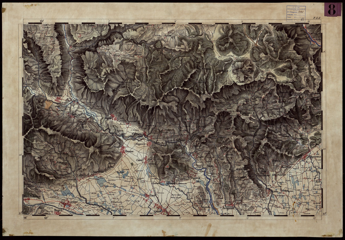 "Carta disegnata in 24 fogli montati su tela, senza titolo e senza data. L'annesso quadro d'unione reca il titolo "Prospetto dei fogli della carta topografica del Regno Lombardo Veneto disegno alla scala 1:43.200 dal vero". Sembra un lavoro fatto dall'Istituto Geografico Austriaco in Milano prima del 1848. La carta si estende da Brescia a Vicenza e da Asiago a Mirandola. L'orografia è rappresentata con acquerello a luce obliqua, l'idrografia è in azzurro le strade sono distinte in sei classi a mezzo di colori. Abitati in rosso. Sono pure distinti a colori boschi, paludi, prati, pascoli: sono indicati i passaggi sui fiumi, gli abitati isolati, ecc. Per la stampa della carta eseguita nel 1859 v. il N°115 d'ordine, Doc. 22 Cartella N°58."
