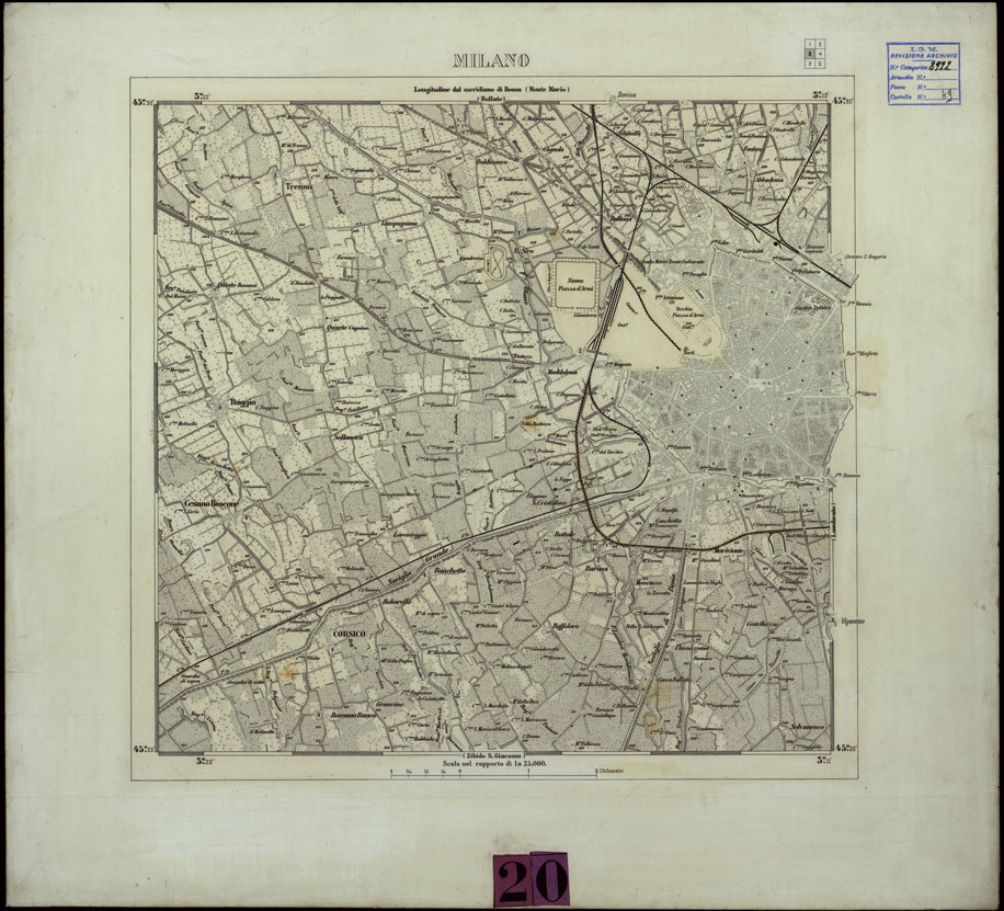 Il governo del Regno, considerando inadeguati i disomogenei lavori preunitari affidò nel 1872 all´Istituto Topografico Militare (il quale assunse l´attuale denominazione nel 1882) l´esecuzione del progetto di rilevamento generale del territorio dello Stato e della formazione della nuova Carta Topografica d´Italia alla scala 1:100000. L´Istituto, formatosi dalla fusione dell´Ufficio Tecnico del Corpo di Stato Maggiore del Regno Sardo con gli Istituti e gli Uffici topografici e cartografici dei diversi stati esistenti nella penisola prima che si compisse la sua unità politica, ereditò il materiale scientifico e cartografico preunitario caratterizzandosi di fatto come il depositario e continuatore della scuola e della tradizione cartografica nazionale.