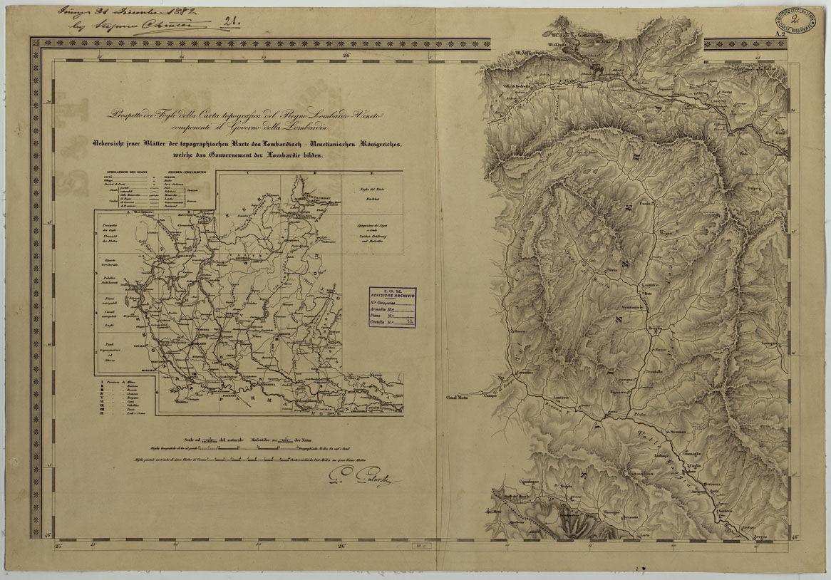 "Carta in quarantadue fogli compresi il titolo e il quadro dei segni convenzionali. Essa venne pubblicata dall'I.G.M. Austriaco, in Milano sulla base, per la parte geodetica, dei lavori in precedenza eseguiti dal Deposito della Guerra di Milano (Regno Italico-Periodo Francese e di quelli dell'Istituto Austriaco stesso, e per la parte topografica sul ricco materiale raccolto dal "Deposito" sopra citato e sulle mappe catastali convenientemente ridotte alla scala di 1:28.000. Proiezione adottata quella di cassini con centro di sviluppo la guglia del Duomo di Milano (45° 27' 34 ", 5 lat. nord e 36° 51' 16", 6 long. est dall'Isola del Ferro). Disegno ed incisione su rame con orografia rappresentata con fine tratteggio a luce zenitale. Gli abitati sono distinti in base alla loro importanza amministrativa con indicazione dei luoghi fortificati. Le strade sono distinte in cinque classi: le ferrovie in tre. Sono indicati i canali navigabili e d'irrigazione. La carta mostra inoltre colture, brughiere, pascoli, prati, alpi, stazioni di posta, fiere e mercati, passaggi e ponti sui fiumi, costruzioni e case isolate, miniere, fabbriche, cave, ecc., confini politici e amministrativi. Altri segni convenzionali si riferiscono ai porti e alle navigazioni dei fiumi. Gli scandagli sono calcolati in piedi di Parigi. Il Foglio 2 contiene il quadro dei segni convenzionali. Altri fogli contengono quadri statistico-amministrativi per la Lombardia e per il Veneto, quadri di unione per le due provincie alla scala 1:1.036.800, il prospetto dei punti trigonometrici e delle elevazioni, ecc. Questa carta è da considerarsi opera essenzialmente italiana poichè eseguita e diretta da italiani, costituì con le carte consimili dei Ducati di Modena e di Parma, della Toscana e dello Stato Pontificio, che ne sono il complemento, la base fondamentale della topografia di gran parte della penisola fino a che non si ebbe la nuova carta topografica ufficiale di Italia. La copia N.3 è incompleta: consta solo dei soli 23 fogli relativi al Veneto, con il quadro dei segni convenzionali riprodotto in fotolito dall'I.G.M. di Firenze nel 1885 è riconosciuta e messa al corrente a tutto il 1865. Pagina 230 del Catalogo Ragionato. La carta è formata da due quadri d'unione. Il primo è quello relativo alla "Carta Topografica del Regno Lombardo-Veneto componenti il Governo della Lombardia " documento 2 cartella 52(da A a D, da 1 a 6), il secondo è invece " Carta Topografica del Regno Lombardo-Veneto componenti il Governo di Venezia "documento 4 cartella 52 (da D a H, da 1 a 6)."