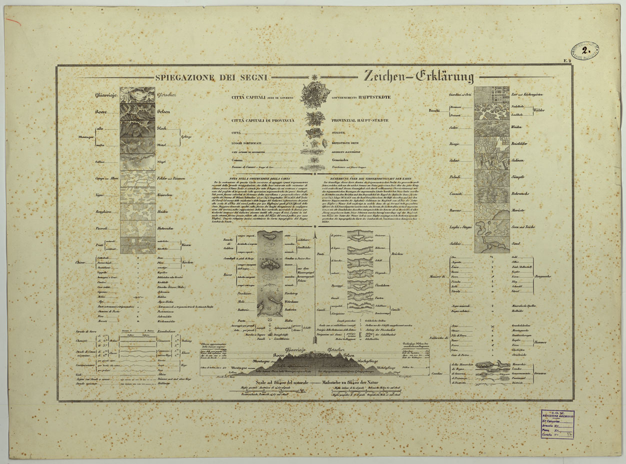 CARTA TOPOGRAFICA DEL REGNO LOMBARDO-VENETO COSTRUTTA SOPRA MISURE ASTRONOMICO-TRIGONOMETRICHE ED INCISA A MILANO NELL'ISTITUTO GEOGRAFICO MILITARE DELL'I.R. STATO MAGGIORE GENARALE AUSTRIACO PUBBLICATA NELL'ANNO - E.2 SEGNI CONVENZIONALI