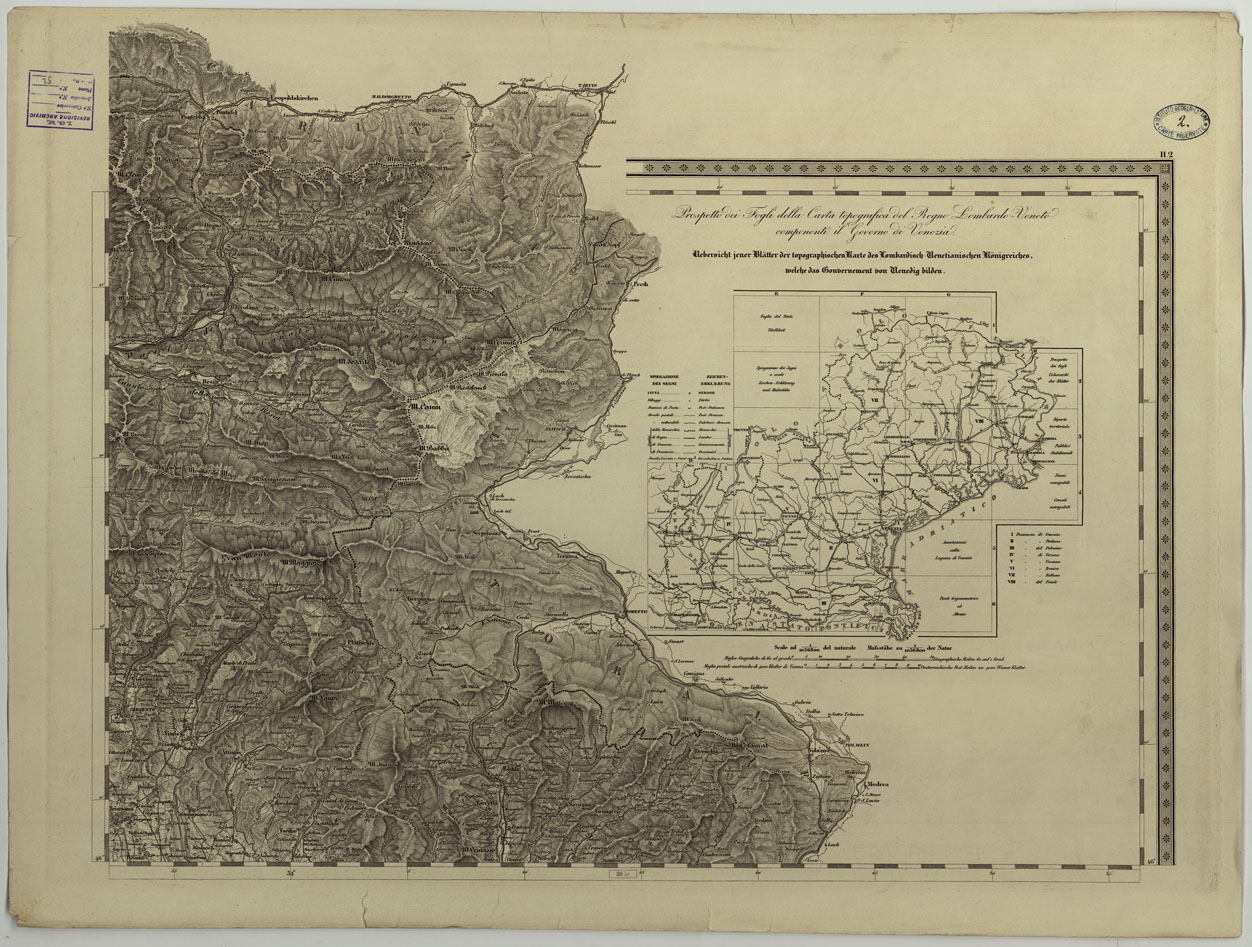 CARTA TOPOGRAFICA DEL REGNO LOMBARDO-VENETO COSTRUTTA SOPRA MISURE ASTRONOMICO-TRIGONOMETRICHE ED INCISA A MILANO NELL'ISTITUTO GEOGRAFICO MILITARE DELL'I.R. STATO MAGGIORE GENARALE AUSTRIACO PUBBLICATA NELL'ANNO - Q,U. H.2