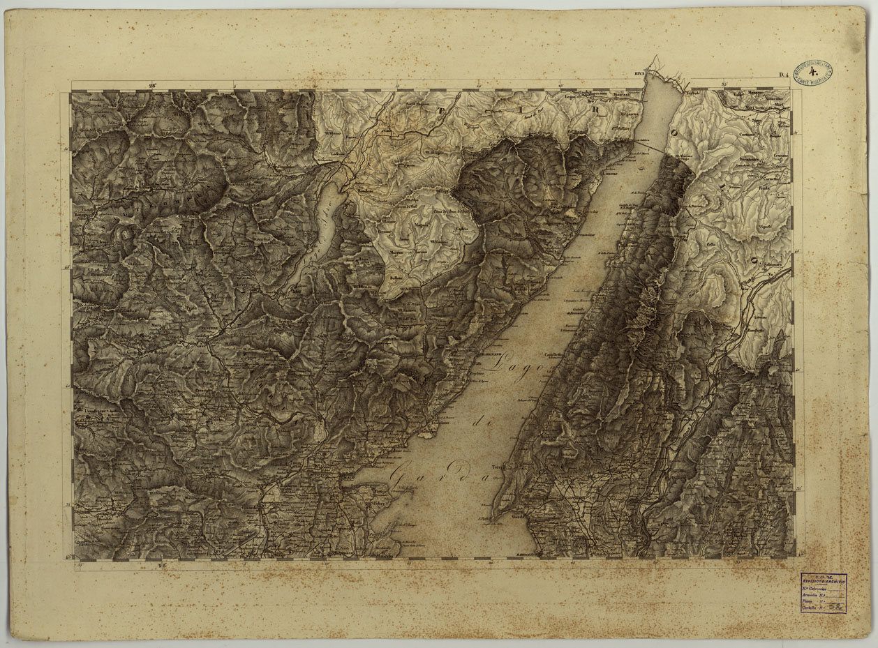 "Carta in quarantadue fogli compresi il titolo e il quadro dei segni convenzionali. Essa venne pubblicata dall'I.G.M. Austriaco, in Milano sulla base, per la parte geodetica, dei lavori in precedenza eseguiti dal Deposito della Guerra di Milano (Regno Italico-Periodo Francese e di quelli dell'Istituto Austriaco stesso, e per la parte topografica sul ricco materiale raccolto dal "Deposito" sopra citato e sulle mappe catastali convenientemente ridotte alla scala di 1:28.000. Proiezione adottata quella di cassini con centro di sviluppo la guglia del Duomo di Milano (45° 27' 34 ", 5 lat. nord e 36° 51' 16", 6 long. est dall'Isola del Ferro). Disegno ed incisione su rame con orografia rappresentata con fine tratteggio a luce zenitale. Gli abitati sono distinti in base alla loro importanza amministrativa con indicazione dei luoghi fortificati. Le strade sono distinte in cinque classi: le ferrovie in tre. Sono indicati i canali navigabili e d'irrigazione. La carta mostra inoltre colture, brughiere, pascoli, prati, alpi, stazioni di posta, fiere e mercati, passaggi e ponti sui fiumi, costruzioni e case isolate, miniere, fabbriche, cave, ecc., confini politici e amministrativi. Altri segni convenzionali si riferiscono ai porti e alle navigazioni dei fiumi. Gli scandagli sono calcolati in piedi di Parigi. Il Foglio 2 contiene il quadro dei segni convenzionali. Altri fogli contengono quadri statistico-amministrativi per la Lombardia e per il Veneto, quadri di unione per le due provincie alla scala 1:1.036.800, ilprospetto dei punti trigonometrici e delle elevazioni, ecc. Questa carta è da considerarsi opera essenzialmente italiana poichè eseguita e diretta da italiani, costituì con le carte consimili dei Ducati di Modena e di Parma, della Toscana e dello Stato Pontificio, che ne sono il complemento, la base fondamentale della topografia di gran parte della penisola fino a che non si ebbe la nuova carta topografica ufficiale di Italia. La copia N.3 è incompleta: consta solo dei soli 23 fogli relativi al Veneto, con il quadro dei segni convenzionali riprodotto in fotolito dall'I.G.M. di Firenze nel 1885 è riconosciuta e messa al corrente a tutto il 1865.Pagina 230 del Catalogo Ragionato. La carta è formata da due quadri di unione. Il primo è quello relativo alla "Carta Topografica del Regno Lombardo-Veneto componenti il Governo della Lombardia " documento 2 cartella 52(da A a D, da 1 a 6), il secondo è invece " Carta Topografica del Regno Lombardo-Veneto componenti il Governo di Venezia "documento 4 cartella 52 (da D a H, da 1 a 6)."