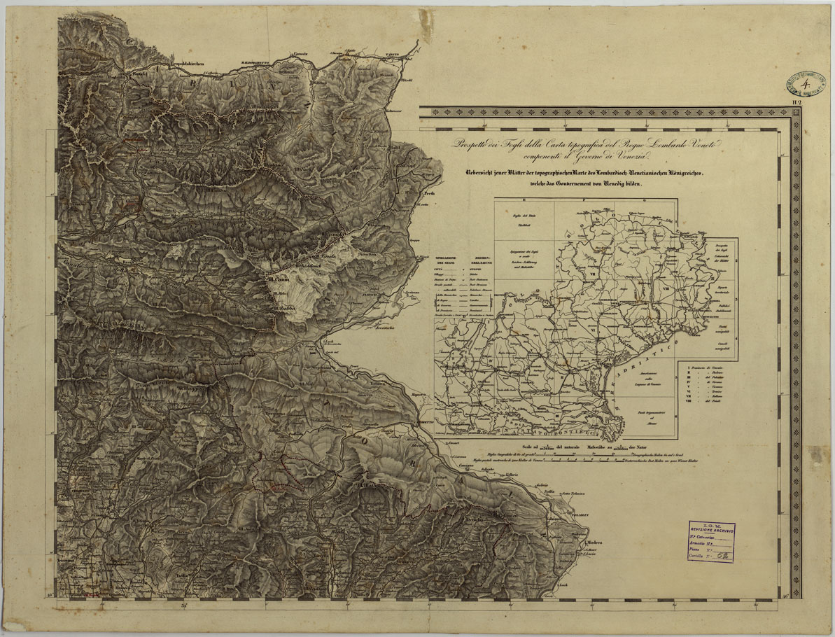 "Carta in quarantadue fogli compresi il titolo e il quadro dei segni convenzionali. Essa venne pubblicata dall'I.G.M. Austriaco, in Milano sulla base, per la parte geodetica, dei lavori in precedenza eseguiti dal Deposito della Guerra di Milano (Regno Italico-Periodo Francese e di quelli dell'Istituto Austriaco stesso, e per la parte topografica sul ricco materiale raccolto dal "Deposito" sopra citato e sulle mappe catastali convenientemente ridotte alla scala di 1:28.000. Proiezione adottata quella di cassini con centro di sviluppo la guglia del Duomo di Milano (45° 27' 34 ", 5 lat. nord e 36° 51' 16", 6 long. est dall'Isola del Ferro). Disegno ed incisione su rame con orografia rappresentata con fine tratteggio a luce zenitale. Gli abitati sono distinti in base alla loro importanza amministrativa con indicazione dei luoghi fortificati. Le strade sono distinte in cinque classi: le ferrovie in tre. Sono indicati i canali navigabili e d'irrigazione. La carta mostra inoltre colture, brughiere, pascoli, prati, alpi, stazioni di posta, fiere e mercati, passaggi e ponti sui fiumi, costruzioni e case isolate, miniere, fabbriche, cave, ecc., confini politici e amministrativi. Altri segni convenzionali si riferiscono ai porti e alle navigazioni dei fiumi. Gli scandagli sono calcolati in piedi di Parigi. Il Foglio 2 contiene il quadro dei segni convenzionali. Altri fogli contengono quadri statistico-amministrativi per la Lombardia e per il Veneto, quadri di unione per le due provincie alla scala 1:1.036.800, il prospetto dei punti trigonometrici e delle elevazioni, ecc. Questa carta è da considerarsi opera essenzialmente italiana poichè eseguita e diretta da italiani, costituì con le carte consimili dei Ducati di Modena e di Parma, della Toscana e dello Stato Pontificio, che ne sono il complemento, la base fondamentale della topografia di gran parte della penisola fino a che non si ebbe la nuova carta topografica ufficiale di Italia. La copia N.3 è incompleta: consta solo dei soli 23 fogli relativi al Veneto,con il quadro dei segni convenzionali riprodotto in fotolito dall'I.G.M. di Firenze nel 1885 è riconosciuta e messa al corrente a tutto il 1865. Pagina 230 del Catalogo Ragionato. La carta è formata da due quadri di unione. Il primo è quello relativo alla "Carta Topografica del Regno Lombardo-Veneto componenti il Governo della Lombardia " documento 2 cartella 52(da A a D, da 1 a 6), il secondo è invece " Carta Topografica del Regno Lombardo-Veneto componenti il Governo di Venezia "documento 4 cartella 52 (da D a H, da 1 a 6)."