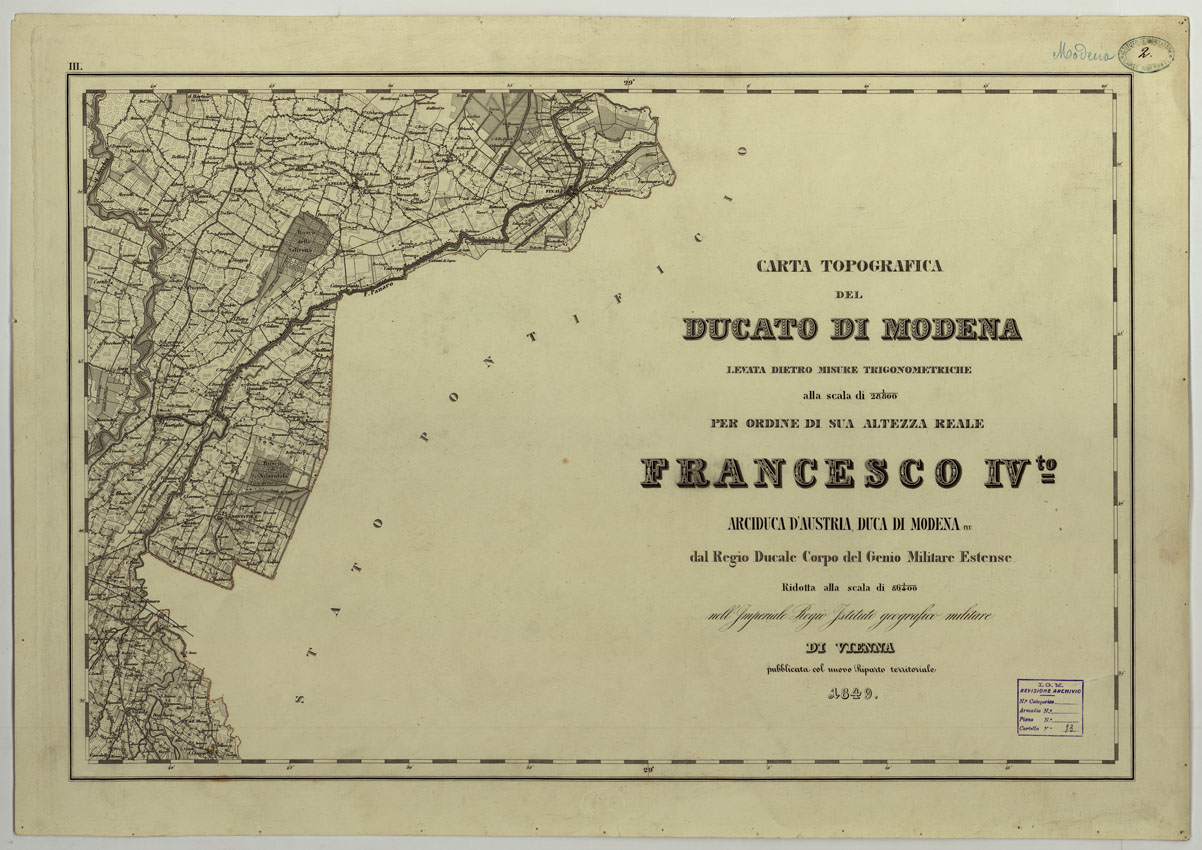 CARTA TOPOGRAFICA DEL DUCATO DI MODENA LEVATA DIETRO MISURE TRIGONOMETRICHE alla scala di 1 28,800 PER ORDINE DI SUA LATEZZA REALE FRANCESCO IV ARCIDUCA D'AUSTRIA, DUCA DI MODENA DEL REGIO DUCALE CORPO DEL GENIO MILITARE ESTENSE - III