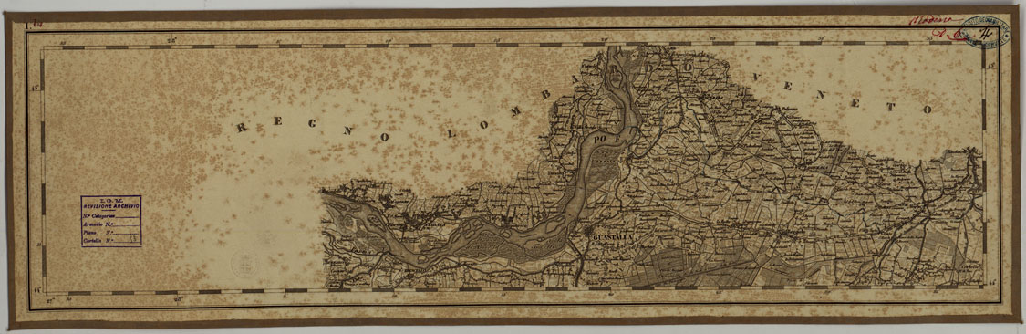 "Ridotta alla scala 1 86,400. Nell'Imperiale Regio Istituto geografico militare di VIENNA pubblicata col nuovo Riparto territoriale 1849. Carta in nove fogli più un Quadro d'Unione, incisi su rame, costruita sulla base dei rilevamenti compiuti dall'Ufficio Topografico modenese, alla scala di 1:28.000, dal 1821 al 1829, per convenzione del 1821, con l'I.G.M., secondo i sistemi dello Stato Maggiore Austriaco. Ridotta e disegnata dall'Istituto Geografico Austriaco a Vienna, nel 1842 si da costituire la continuazione della carta alla stessa scala del Lombardo Veneto (v. n. 81 d'ordine, Cart. d'Arch. n. 52-53, Docum. 2 e 4). Per disegno, segni convenzionali, dimensioni, ecc., la carta corrisponde esattamente a quella già descritta del Lombardo-Veneto. V'è annesso un quadro d'unione in fotolito eseguito dall'I.G.M. di Firenze nel 1885, essendone la carta priva. La copia n. 8 è in fogli montati su tela. "