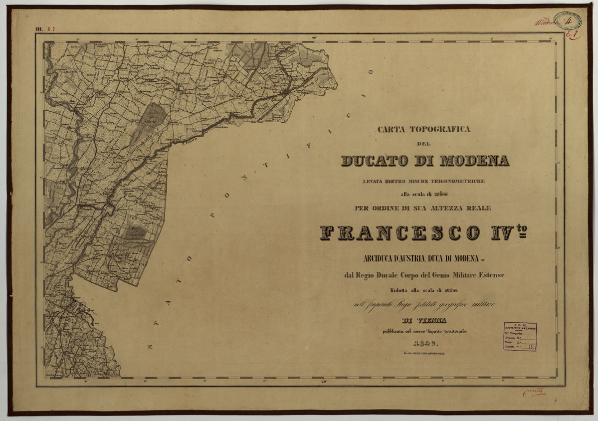 CARTA TOPOGRAFICA DEL DUCATO DI MODENA LEVATA DIETRO MISURE TRIGONOMETRICHE alla scala di 1 28,800 PER ORDINE DI SUA LATEZZA REALE FRANCESCO IV ARCIDUCA D'AUSTRIA, DUCA DI MODENA DEL REGIO DUCALE CORPO DEL GENIO MILITARE ESTENSE - E.7