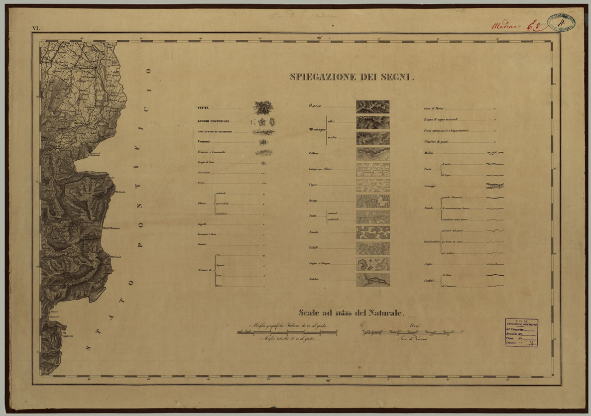 CARTA TOPOGRAFICA DEL DUCATO DI MODENA LEVATA DIETRO MISURE TRIGONOMETRICHE alla scala di 1 28,800 PER ORDINE DI SUA LATEZZA REALE FRANCESCO IV ARCIDUCA D'AUSTRIA, DUCA DI MODENA DEL REGIO DUCALE CORPO DEL GENIO MILITARE ESTENSE - VI