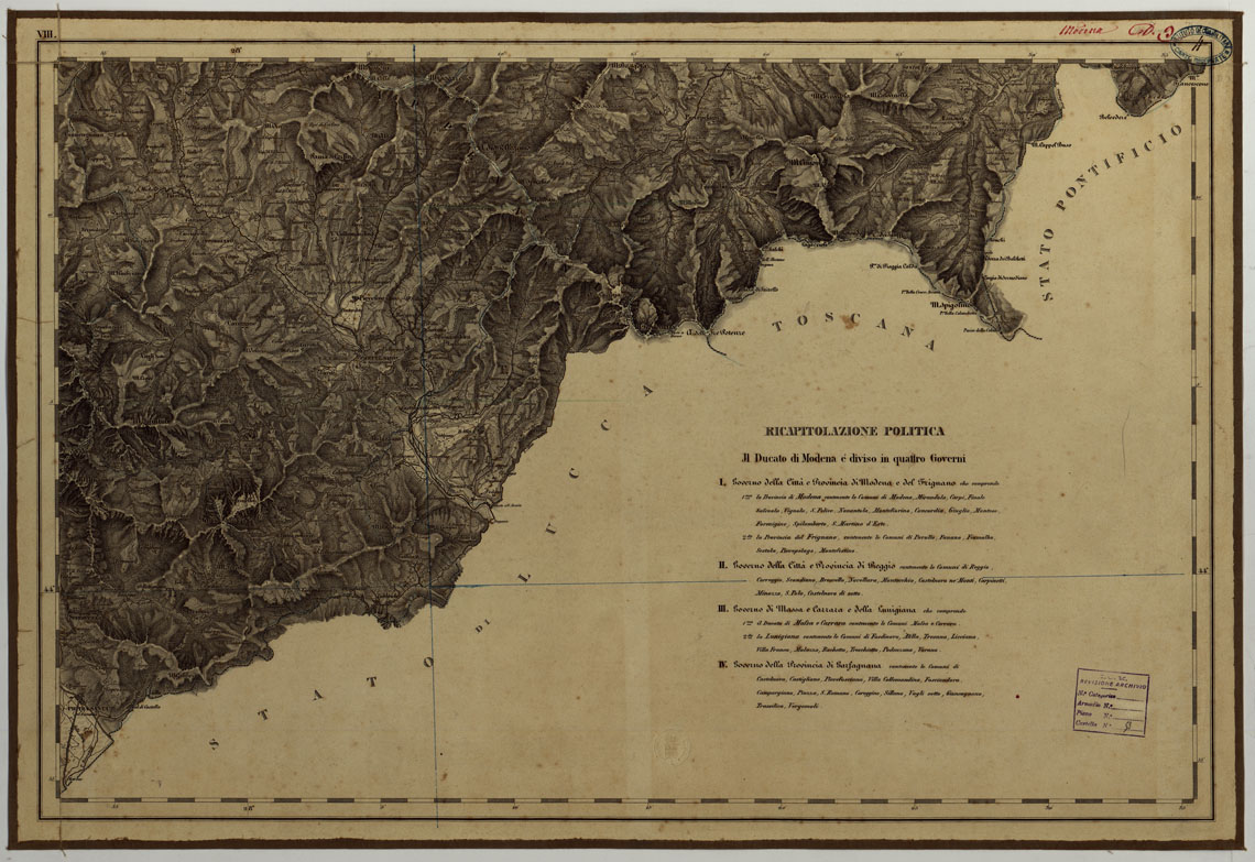 CARTA TOPOGRAFICA DEL DUCATO DI MODENA LEVATA DIETRO MISURE TRIGONOMETRICHE alla scala di 1 28,800 PER ORDINE DI SUA LATEZZA REALE FRANCESCO IV ARCIDUCA D'AUSTRIA, DUCA DI MODENA DEL REGIO DUCALE CORPO DEL GENIO MILITARE ESTENSE - VIII