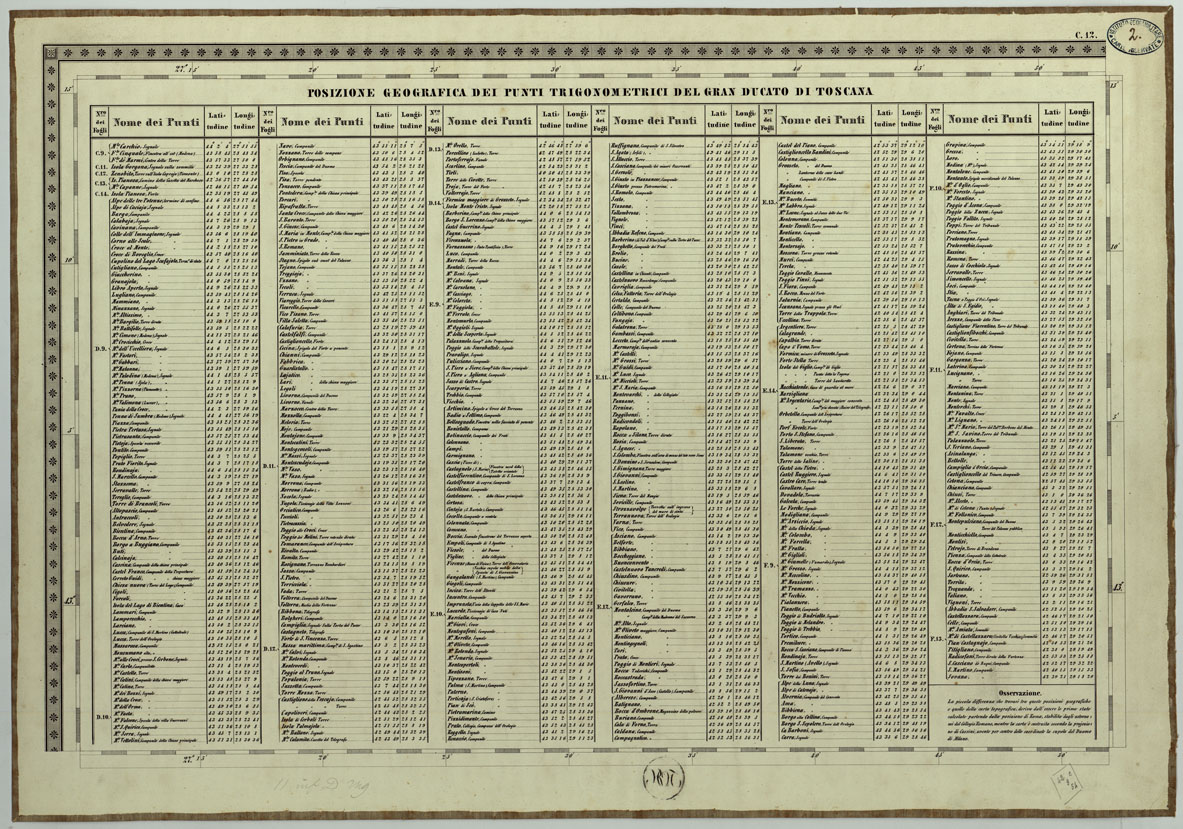 CARTA TOPOGRAFICA DELLO STATO PONTIFICIO E DEL GRAN-DUCATO DI TOSCANA COSTRUTTA SOPRA MISURE ASTRONOMICO TRIGONOMETRICHE ED INCISA SOPRA PIETRA A VIENNA NELL'I.R. ISTITUTO GEOGRAFICO MILITARE - FOGLIO C.12 PUNTI TRIGONOMETRICI