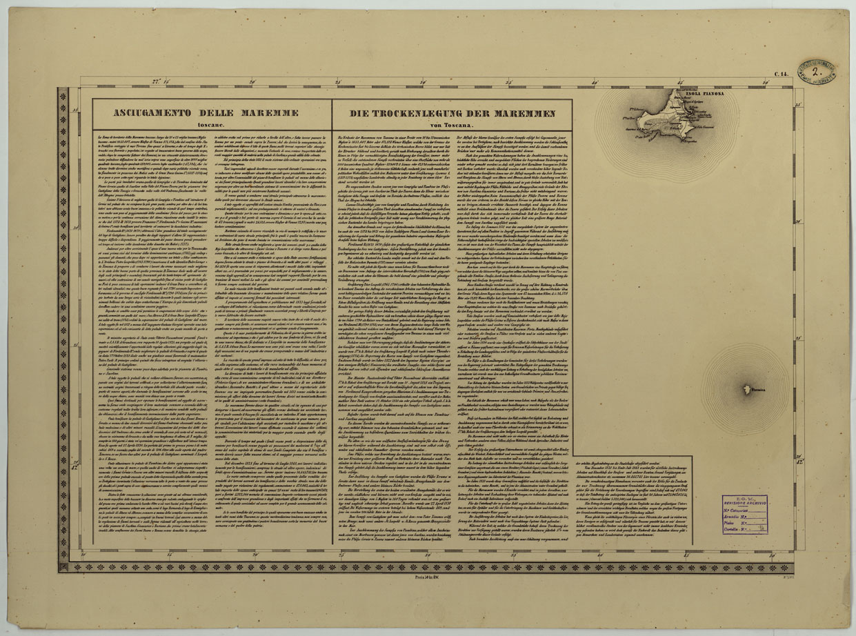 "Carta in 53 fogli compreso il titolo, costruita dall'I.G.M. Austriaco col consenso del Granducato e dello Stato Pontificio, poggiata su regolare triangolazione eseguita dall'Ing. Giovanni Marieni dal 1840 al 1843 e basata per la parte topografica su le mappe catastali rivedute sul terreno. Per sistema di proiezione, disegno, dimensioni, ecc., consimile alle carte alla stessa scala del Lombardo-Veneto, e dei Ducati di Modena e Parma (vedi Carta Topografica del Regno Lombardo-Veneto... n. 81 d'ordine - Cart. d'Arch. n. 52 - Docum. n. 2 e 4 Carta Topografica dei Ducati di Parma Piacenza e Guastalla... n. 8 d'ordine - Cart. d'Archivio n. 53 - Docum. n. 5 e 6 Carta Topografica del Ducato di Modena... n. 10 d'ordine - cart. d'Archivio n. 53 - Docum. n. 7 e 8). Per maggiori notizie vedasi Mori A., La cartografia ufficiale in Italia e L'I.G.M., Pagg. 69-70 e 80. La carta mostra gli abitati distinti in base alla loro importanza amministrativa, i luoghi fortificati, comuni, frazioni di comuni, boschi, prati, saline, vigne, oliveti, risaie, paludi, canneti, barene, sabbie, ecc., le ferrovie, le strade di 1a e 2a classe, quelle provinciali, le comunali, le comunicazioni per carri, bestie, pedoni, argini, acquedotti, confini politici ed amministrativi, ecc. Orografia a tratteggio. Essa è inoltre sussidiata di numerose notizie geografiche, storiche e statistiche, tabelle delle elevazioni dei punti trigonometrici sul livello del mare, delle coordinate geografiche, dei luoghi principali, ecc. V'è pure annesso un quadro d'unione e un " Cenno " sulla costruzione della carta. Una delle due copie inventariate sotto il n. 85 dell'inv. gener. (carta della Biblioteca) ha una riproduzione del foglio titolo eseguita dall'I.G.M. nel 1885."