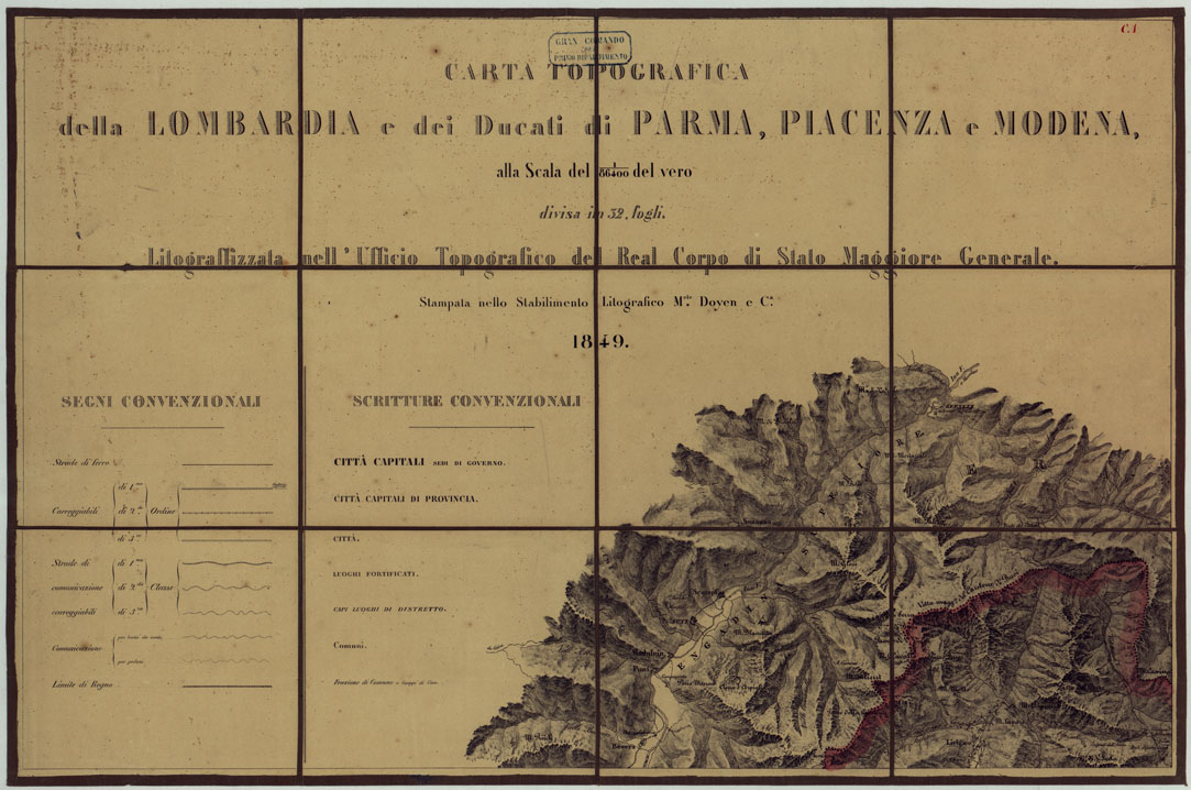 CARTA TOPOGRAFICA DELLA LOMBARDIAE DEI DUCATI DI PARMA, PIACENZA E MODENA ALLA SCALA DEL 1 86.400 DEL VERO DIVISA IN 32 FOGLI. LITOGRAFFIZZATA NELL'UFFICIO TOPOGRAFICO DEL REAL CORPO DI STATO MAGGIORE GENERALE - FOG. C.1