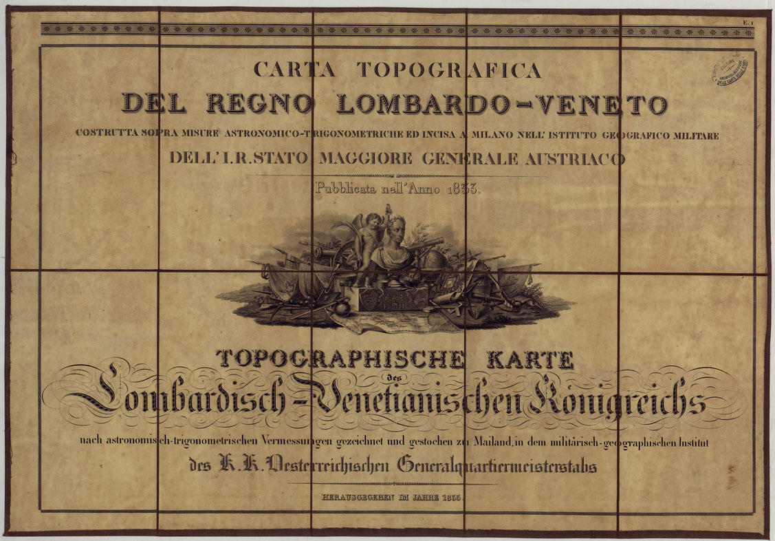 CARTA TOPOGRAFICA REGNO LOMBARDO-VENETO COSTRUTTA SOPRA MISURE ASTRONOMICO-TRIGONOMETRICHE ED INCISA A MILANO NELL'ISTITUO GEOGRAFICO MILTARE DELL'I.R. STATO MAGGIORE GENERALE AUSTRIACO. PUBBLICATA NELL'ANNO 1833 - FOGLIO E.1 TITOLO