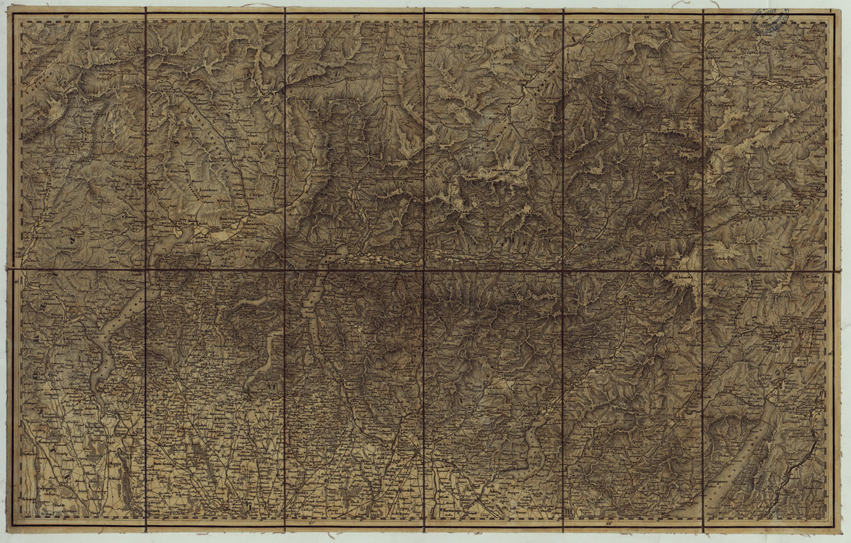 "Carta in quattro fogli incisi su rame montati su tela a stacchi. Orografia rappresentata col tratteggio a luce zenitale. Abitati distinti in base alla loro importanza amministrativa. Strade distinte in cinque classi. Sono indicate le stazioni di posta, le miniere, le fabbiche, i passaggi sui fiumi, boschi, risaie, paludi, ecc. i confini politici ed amministrativi, ecc. Il foglio III contiene i due titoli e in tedesco, la leggenda dei segni convenzionali e un prospetto delle divisioni amministrative. Annesso un piccolo quadro d'unione."