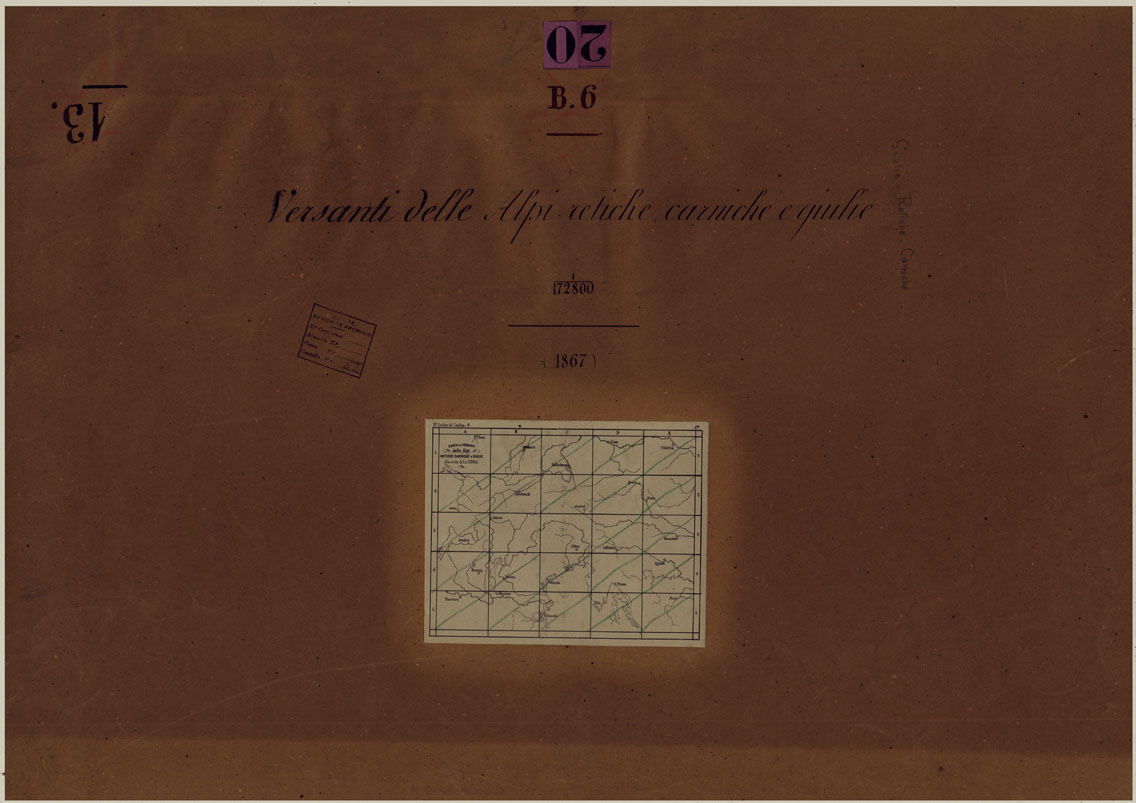 "Autografia dell'originale di cui al N°131 d'ordine (Cart d'Archivio N°44, Doc. N°1) in ventitre fogli. Alcuni recano le acque colorate in azzurro. (V.Mori A., La cartografia ufficiale in Italia e l'I.G.M., pag. 141)."