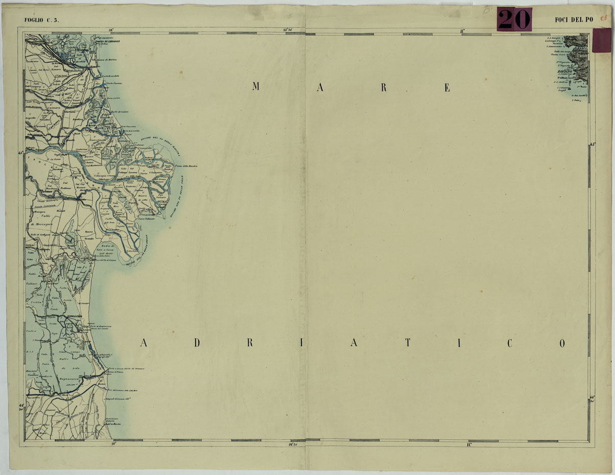 "Autografia dell'originale di cui al N°131 d'ordine (Cart. d'Arch. N°44, Doc. N°1). in ventitre fogli. Alcuni recano le acque colorate in azzurro, (V: Mori A., La cartografia ufficiale in Italia e l'I.G.M., pag. 141)."