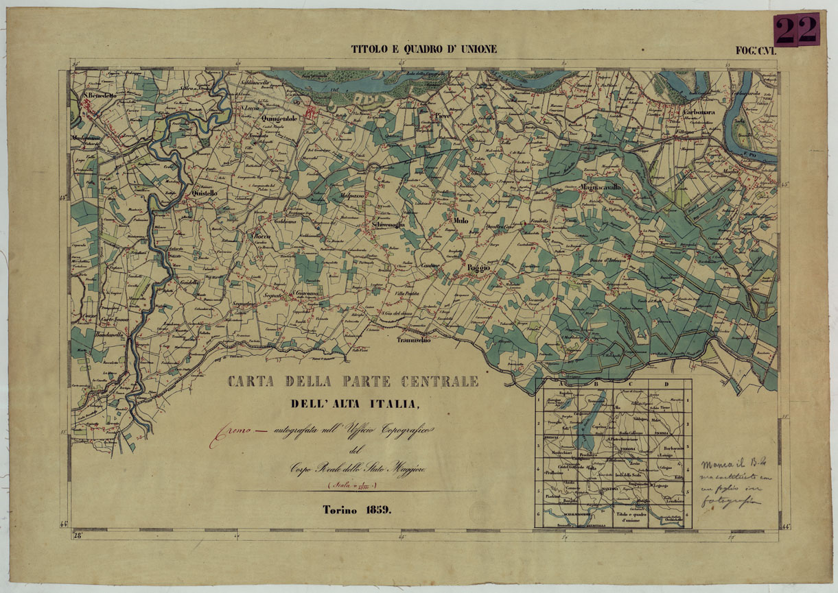 CARTA DELLA PARTE CENTRALE DELL'ALTA ITALIA AUTOGRAFATA NELL'UFFICIO TOPOGRAFICO DEL CORPO REALE DELLOSTATO MAGGIORE TORINO 1859 - FOG.C.VI QUADRO D'UNIONE