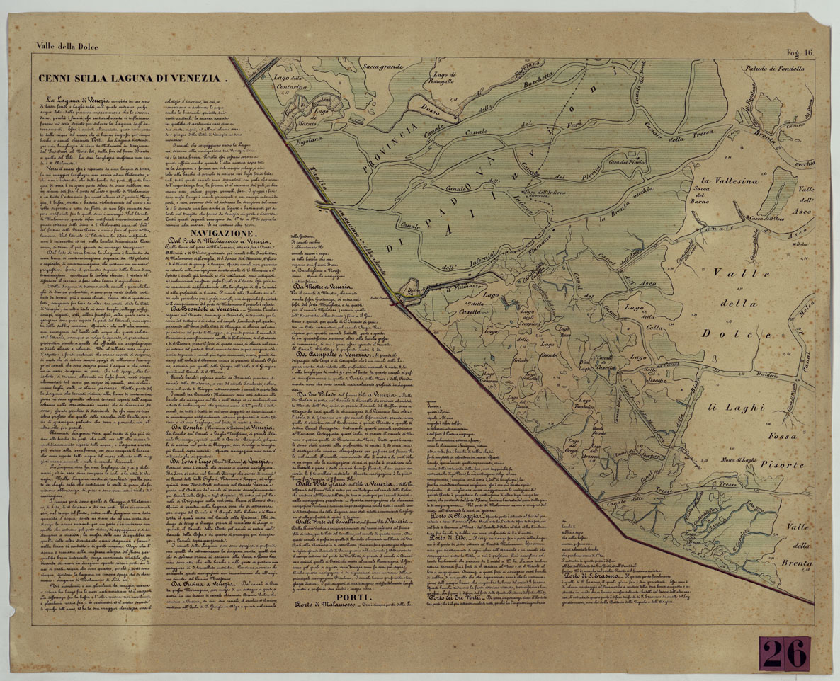 "Carta in 18 fogli più quadro d'unione eseguita in autografia dall'Ufficio Tecnico di Stato Maggiore. Stampa a colori. Sono indicati abitati, strade (3 classi), ferrovie, canali, pascoli, prati, orti, sabbie, saline, paludi (praticabili non praticabili, barene), ecc. gli scandagli sono calcolati in metri. Sono particolarmente messe in rilievo le opere fortificatorie delle quali è dato anche un elenco numerico nel foglio N° 11. Il foglio N° 16 contiene cenni descrittivi generali e dati su la navigazione e i porti della Laguna Veneta. Annesso un quadro d'unione."