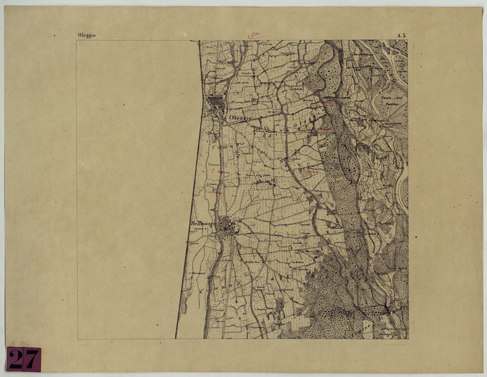 "Carta in nove più un quadro d'unione fogli ad uso delle esercitazioni campali senza data nè arma. Mostra l'orografia col tratteggio a luce zenitale : indica le ferrovie,le strade e sentieri,boschi e terreni incolti,i confini comunali. Vi sono correzioni a mano,in rosso. Il foglio C3 contiene la leggenda dei Segni Convenzionali. Annesso un piccolo quadro di unione. Lavoro eseguito dall'Ufficio Tecnico nel 1863."