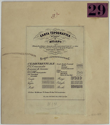 CARTA TOPOGRAFICA DEI CONTORNI DI MILANO RILEVATA D'IN SUL TERRENO E DISEGNATA NELLA PROPORZIONALE SCALA DI 1 A 25.000 DAL PRIMO TENENTE INGEGNERE GEOGRAFO PENSIONATO GIOVANNI BRENNA A. VALLARDI, EDIT. SEGNI CONVENZIONALI.