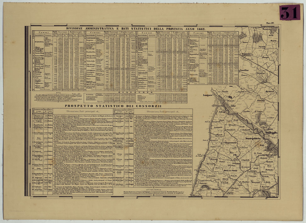 "Riveduta, corretta e completata colla indicazione delle coltivazioni e delle altezze del piano campagna sul livello del Mare e colle piante dei capoluoghi Distrettuali DEDICATA ALLA DEPUTAZIONE PROVINCIALE DI PADOVA che incoraggiò l'opera 1882. Carta in dodici fogli in litografia montati su tela. Stampa in nero. Orografia a tratteggio a luce zenitale. Sono indicati i centri abitati (distinti in base alla loro importanza amministrativa), ferrovie (in esercizio e in costruzione), le strade (5 classi), argini, confini politici ed amministrativi, costruzioni isolate, giardini, boschi, colture, fiumi e canali, ecc,ecc,. Carta ricca di dettagli e assai nitida. Il foglio N°I contiene il titolo, il quadro d'unione e la leggenda dei segni convenzionali i fogli N° III,VI,IX contengano varie piantine dei capoluoghi distrettuali alla scala di 1:10.000 il foglio N° IV prospetti statistico amministrativi i fogli N° XI e XII prospetti idrometrici e altimetrici."