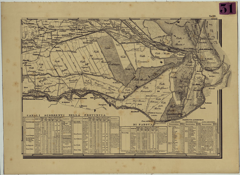 CARTA IDROGRAFICA STRADALE AMMINISTRATIVA CONSORZIALE DELLA PROVINCIA DI PADOVA E DEI TERRENI CHE SI ESTENDANO FINO ALLA SINISTRA SPONDA DEL FIUME ADIGE E LA LAGUNA DI CHIOGGIA. II EDIZIONE RIDOTTA ALLA SCALA DI 1 50.000. -TAVOLA XII