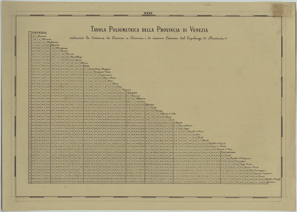 "Carta in trentadue fogli notevoli per la chiarezza e nitidezza. Incisione su pietra. Stampa in nero. Distingue gli abitati in base alla loro importanza amministrativa mostra le ferrovie, le strade (classificate in nazionali, provinciali e comunali), i confini di provincia, di distretto, di comune, ecc. I fogli N°I e V contengano il titolo, la scala e la leggenda dei segni convenzionali il foglio N°11 reca il quadro d'unione. I fogli N° 16,20,23,24,28 contengano rispettivamente piante di Malamocco, Venezia (1:10.000), Chioggia, Mestre, Mirano, Dolo e S. Donà (8.000). Il foglio N°29 reca una "Tavola Poliometrica della Provincia di Venezia indicante la distanza da Comune a Comune, e di ciascun Comune del Capoluogo di Provincia" e il foglio N°32 un "Prospetto dimostrativo della popolazione della Provincia di Venezia giusta l'ultimo censimento approvato con R. decreto 15 Dicembre 1872".2".."."