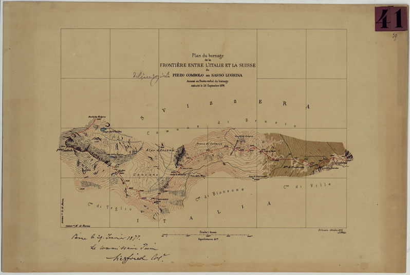 PLAN DU BORNAGE DE LA FRONTIERE ENTRE L'ITALIE ET LA SUISSE DU PIZZO COLOMBO AU SASSO LUGHINA. ANNEXE AU PROCES-VRBALDU BORNAGE EXECUTE' LE 29 SEPTEMBRE 2° COPIA