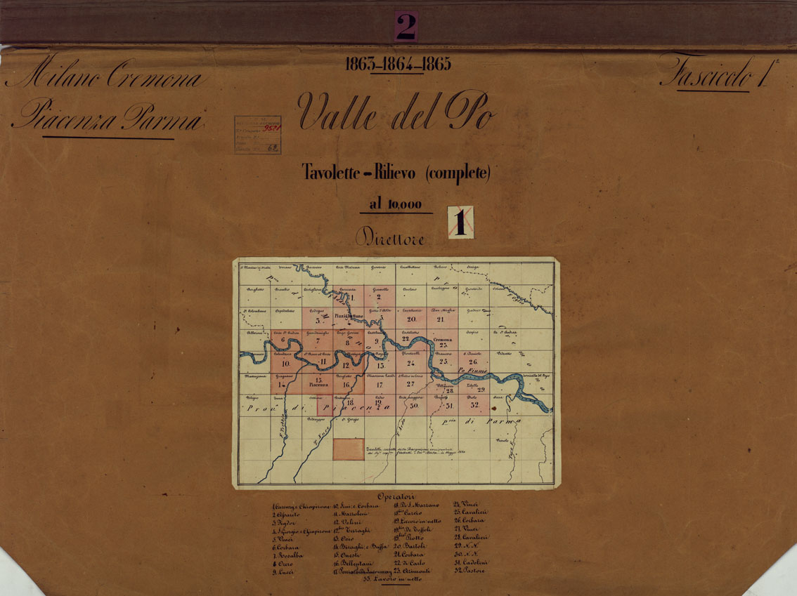"Trentasette tavolette montate su tela disegnate ad acquerello piu un quadro d'unione. Coprono la Valle Padana da Calendasco (ovest) a S. Daniele (est) e da Cavacurta (nord) a Busseto (sud). Le acque sono colorate in azzurro. Le costruzioni sono riempite in rosso. Ciascun foglio reca la data e il nome degli operatori. Varie di queste tavolette (Piacenza e dintorni) furono riconosciute nel 1880. (v. Cart. N° 62, Docum. N° 1). Annesso un piccolo quadro d'unione con elenco di tutti gli operatori."