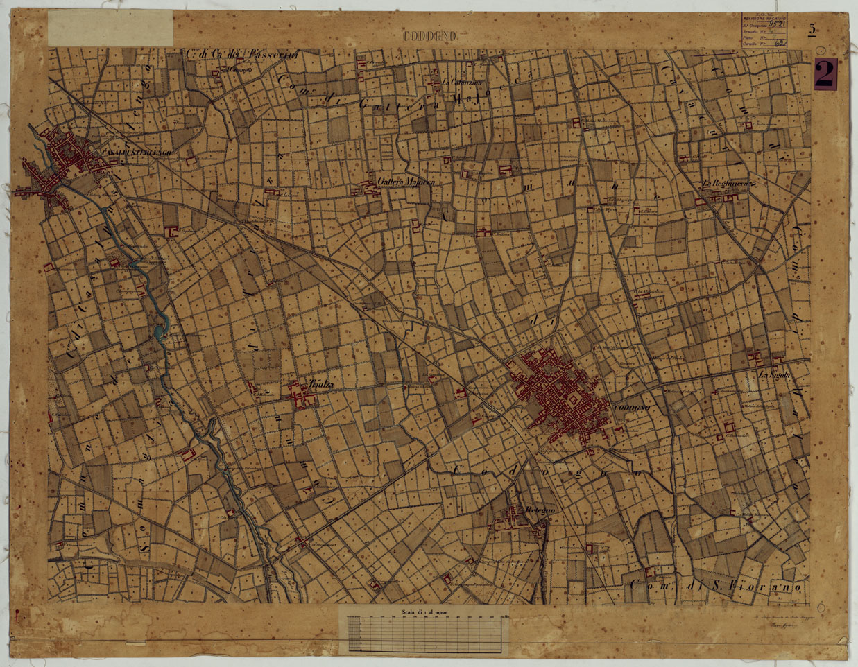 "Trentasette tavolette montate su tela disegnate ad acquerello piu un quadro d'unione. Coprono la Valle Padana da Calendasco (ovest) a S. Daniele (est) e da Cavacurta (nord) a Busseto (sud). Le acque sono colorate in azzurro. Le costruzioni sono riempite in rosso. Ciascun foglio reca la data e il nome degli operatori. Varie di queste tavolette (Piacenza e dintorni) furono riconosciute nel 1880. (v. Cart. N° 62, Docum. N° 1). Annesso un piccolo quadro d'unione con elenco di tutti gli operatori."