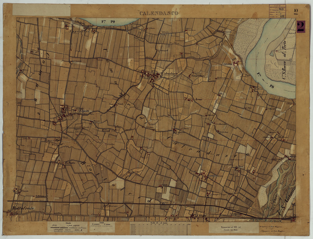 "Trentasette tavolette montate su tela disegnate ad acquerello piu un quadro d'unione. Coprono la Valle Padana da Calendasco (ovest) a S. Daniele (est) e da Cavacurta (nord) a Busseto (sud). Le acque sono colorate in azzurro. Le costruzioni sono riempite in rosso. Ciascun foglio reca la data e il nome degli operatori. Varie di queste tavolette (Piacenza e dintorni) furono riconosciute nel 1880. (v. Cart. N° 62, Docum. N° 1). Annesso un piccolo quadro d'unione con elenco di tutti gli operatori."