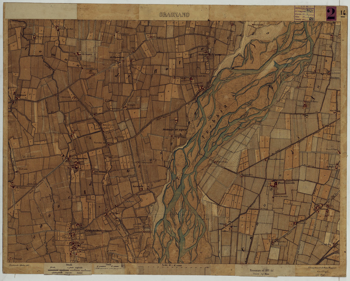 "Trentasette tavolette montate su tela disegnate ad acquerello piu un quadro d'unione. Coprono la Valle Padana da Calendasco (ovest) a S. Daniele (est) e da Cavacurta (nord) a Busseto (sud). Le acque sono colorate in azzurro. Le costruzioni sono riempite in rosso. Ciascun foglio reca la data e il nome degli operatori. Varie di queste tavolette (Piacenza e dintorni) furono riconosciute nel 1880. (v. Cart. N° 62, Docum. N° 1). Annesso un piccolo quadro d'unione con elenco di tutti gli operatori."