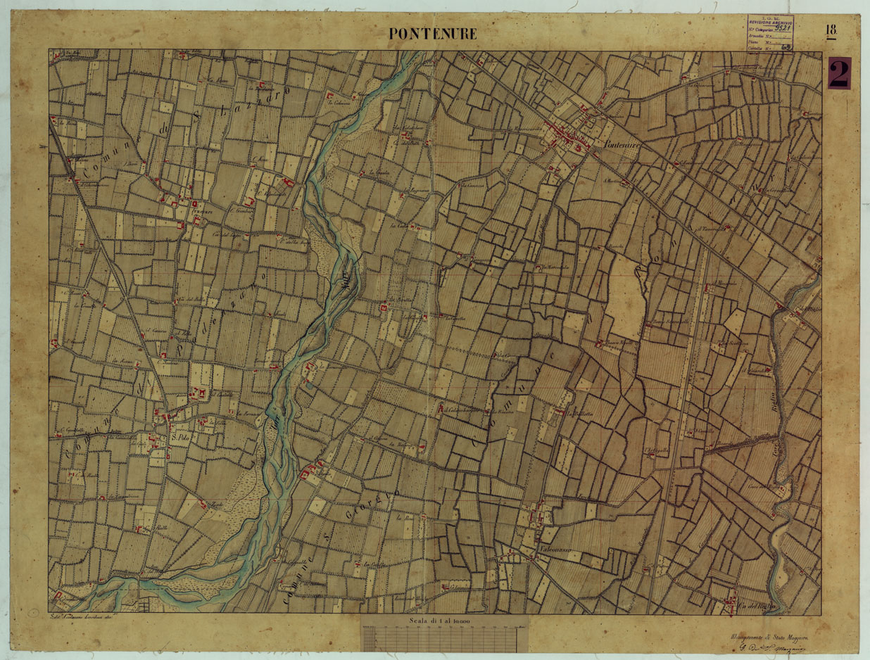 "Trentasette tavolette montate su tela disegnate ad acquerello piu un quadro d'unione. Coprono la Valle Padana da Calendasco (ovest) a S. Daniele (est) e da Cavacurta (nord) a Busseto (sud). Le acque sono colorate in azzurro. Le costruzioni sono riempite in rosso. Ciascun foglio reca la data e il nome degli operatori. Varie di queste tavolette (Piacenza e dintorni) furono riconosciute nel 1880. (v. Cart. N° 62, Docum. N° 1). Annesso un piccolo quadro d'unione con elenco di tutti gli operatori."
