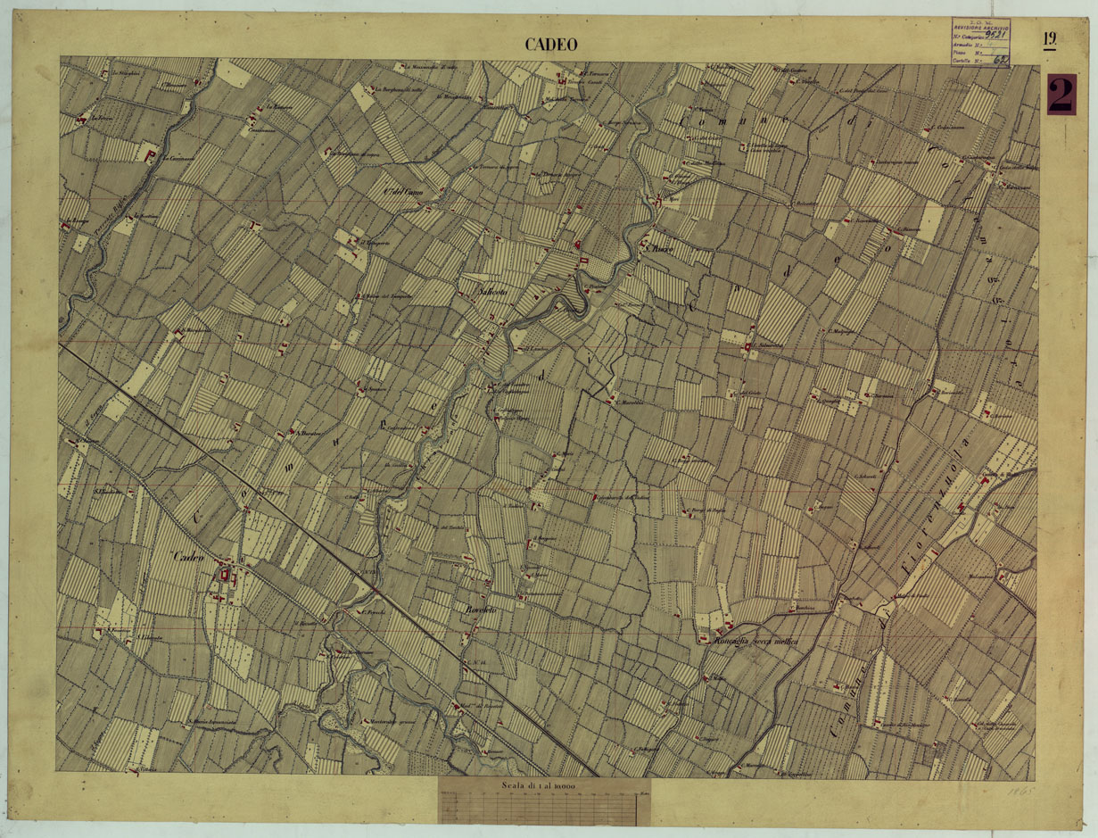 "Trentasette tavolette montate su tela disegnate ad acquerello piu un quadro d'unione. Coprono la Valle Padana da Calendasco (ovest) a S. Daniele (est) e da Cavacurta (nord) a Busseto (sud). Le acque sono colorate in azzurro. Le costruzioni sono riempite in rosso. Ciascun foglio reca la data e il nome degli operatori. Varie di queste tavolette (Piacenza e dintorni) furono riconosciute nel 1880. (v. Cart. N° 62, Docum. N° 1). Annesso un piccolo quadro d'unione con elenco di tutti gli operatori."