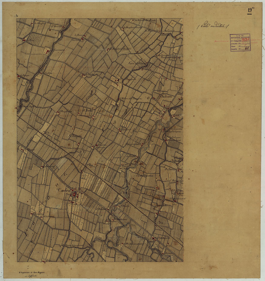 "Trentasette tavolette montate su tela disegnate ad acquerello piu un quadro d'unione. Coprono la Valle Padana da Calendasco (ovest) a S. Daniele (est) e da Cavacurta (nord) a Busseto (sud). Le acque sono colorate in azzurro. Le costruzioni sono riempite in rosso. Ciascun foglio reca la data e il nome degli operatori. Varie di queste tavolette (Piacenza e dintorni) furono riconosciute nel 1880. (v. Cart. N° 62, Docum. N° 1). Annesso un piccolo quadro d'unione con elenco di tutti gli operatori."