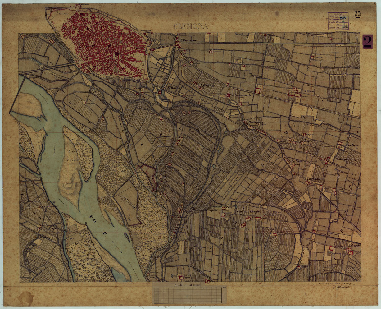 "Trentasette tavolette montate su tela disegnate ad acquerello piu un quadro d'unione. Coprono la Valle Padana da Calendasco (ovest) a S. Daniele (est) e da Cavacurta (nord) a Busseto (sud). Le acque sono colorate in azzurro. Le costruzioni sono riempite in rosso. Ciascun foglio reca la data e il nome degli operatori. Varie di queste tavolette (Piacenza e dintorni) furono riconosciute nel 1880. (v. Cart. N° 62, Docum. N° 1). Annesso un piccolo quadro d'unione con elenco di tutti gli operatori."